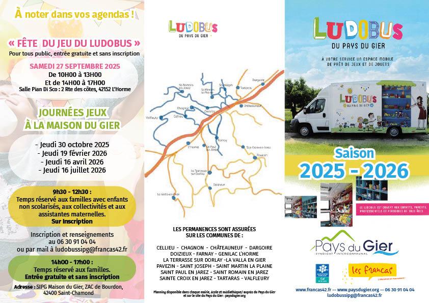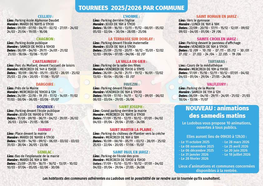 Chaque mois le ludobus fait escale dans les communes du territoire : Cellieu, Chagnon, Châteauneuf, Dargoire, Doizieux, Saint-Just-en-Doizieux, Farnay, Genilac, La Terrasse-sur-Dorlay, L’Horme, La Valla en Gier, Pavezin, Rive de Gier, Saint Joseph, Saint Martin la Plaine, Saint Paul en Jarez, Saint Romain en Jarez, Sainte Croix en Jarez, Tartaras, Valfleury